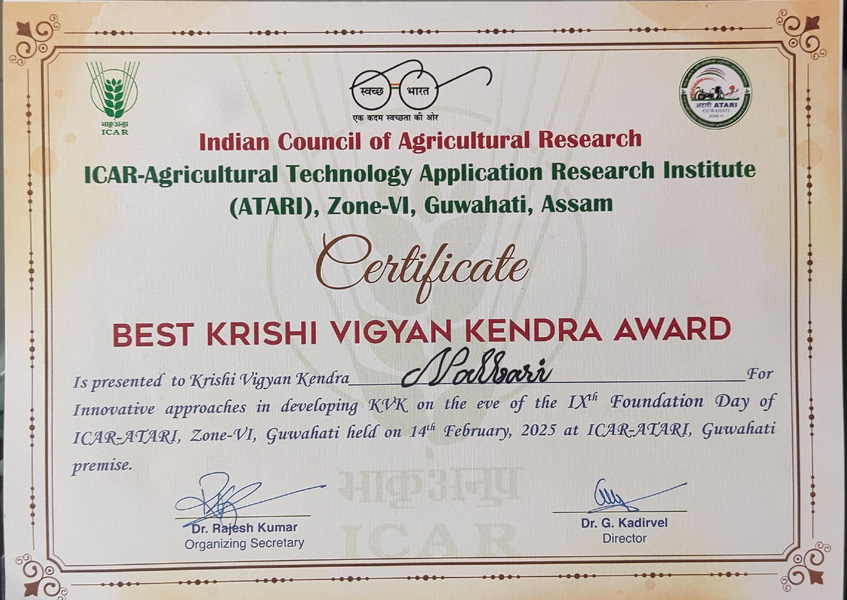 Krishi Vigyan Kendra, Nalbari was established in the year 2004,It is one of the 23 KVKs functioning presently under the Assam Agricultural University, Jorhat. It comes under ATARI, Guwahati, Zone-VI. The office started functioning its activities from June, 2004 in a rented house under the leadership of Programme Coordinator, Dr. H C Bhattacharyya and afterwards the office started functioning in its own campus at Sariahtoli, Milanpur since 23rd October 2010. KVK Nalbari has made phenomenal contribution in the farming sector of the district through mandated and other extension activities including flagship programmes of Govt. of India in a good convergence with district administration and line departments. It received zonal best KVK award from ICAR in 2015 and it is also instrumental in bringing many laurels to farmers and farm women of the district at national level. To implement the mandates effectively, the following activities are envisaged for each KVK: